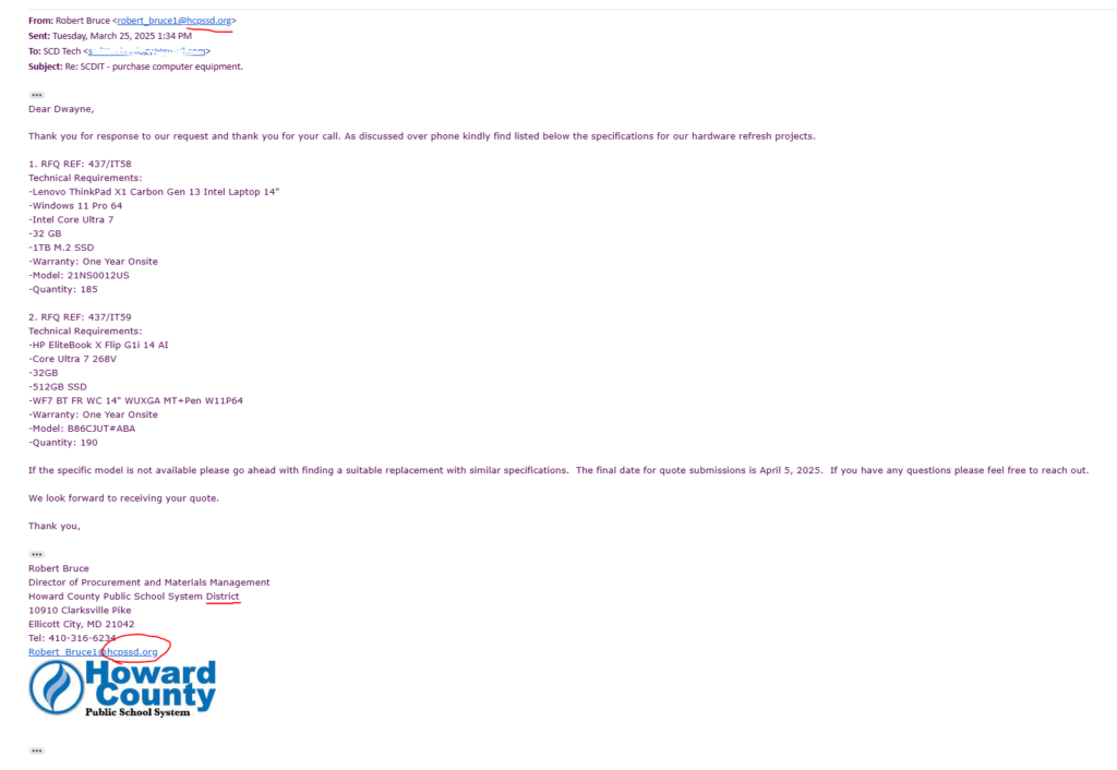 We get these from time to time, but we have never written about it. We just want to do IT work and fix stuff, so we find these annoying and just want to put a warning. They often come from “State” agencies who need equipment. Often the information is slightly skewed. In the last case we noticed the email address had an extra letter “d” to the domain. Here is what their emails look like. We highlighted the things that tipped us off.